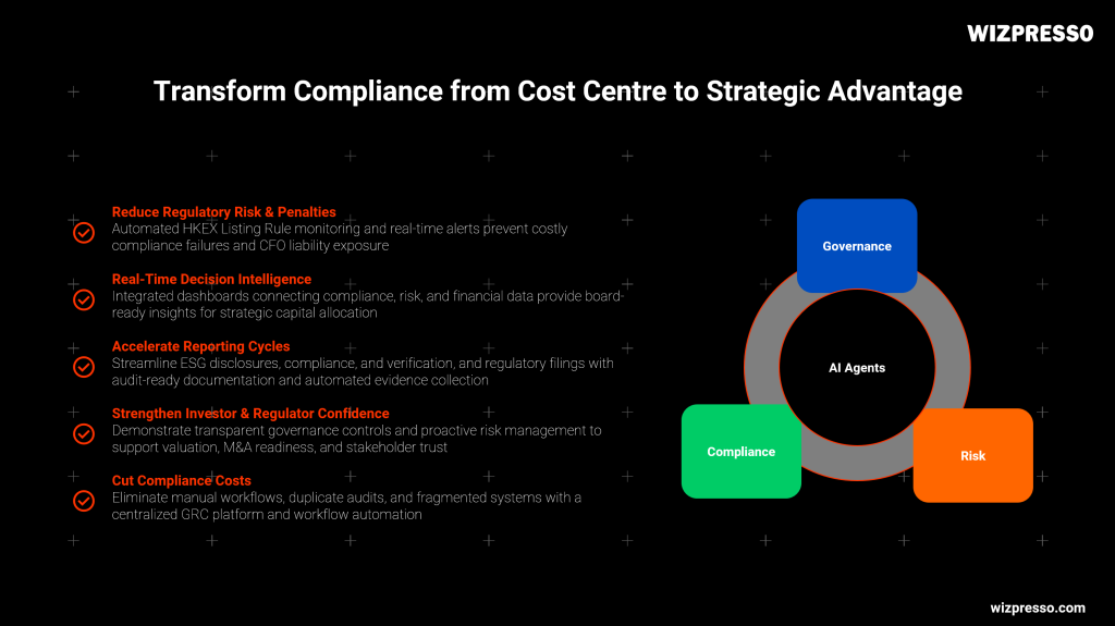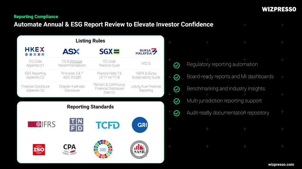 Wizpresso Diligence is an AI-driven reporting compliance platform designed to help finance and governance leaders manage complex disclosure obligations end to end. It centralises reporting workflows, improves consistency across reports, and embeds regulatory intelligence into everyday drafting and review. By consolidating these capabilities into one GRC environment, organisations gain a unified view of their reporting compliance posture instead of juggling multiple point tools.