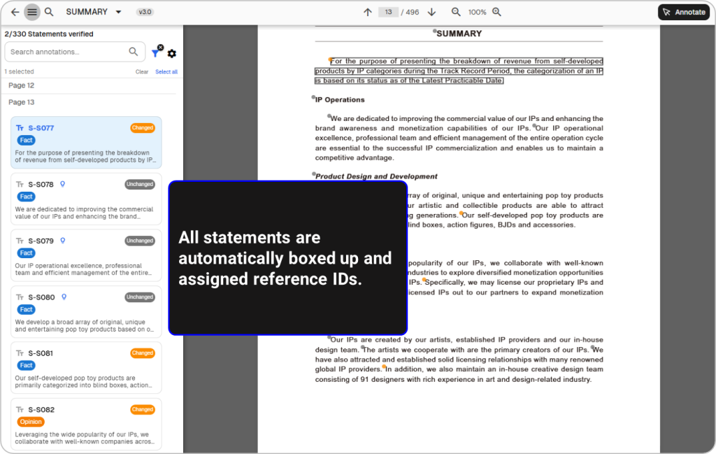 A single prospectus can contain over 10,000 statements and data points scattered across risk factors, business descriptions, MD&A, financial information, and expert sections. Distinguishing which statements are material—and whether they express factual assertions or subjective views—is a non‑trivial, judgment‑intensive task. Without structure, verification grids balloon in size, and teams rely on manual tagging and spreadsheets that are easy to break and hard to keep synchronized with evolving drafts.