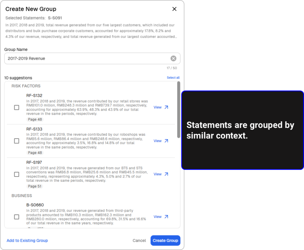 Factify intelligently groups similar and repeated statements across the prospectus through AI-driven recommendations. When a user reviews or updates the verification of a statement in one section, they can immediately see linked or similar statements elsewhere and propagate verification decisions or checks accordingly. This reduces redundant effort, ensures consistent treatment of the same disclosure across the document, and minimizes the risk of misalignment when figures or wording change late in the process.