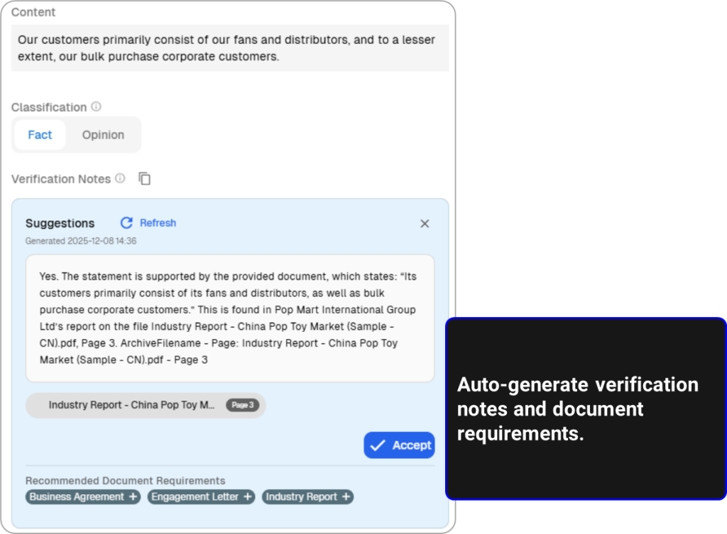 Factify automates this heavy lifting by screening all uploaded documents and suggesting verification citations for each factual statement. The system identifies relevant passages, pages, and sections across the document corpus and proposes links back to the statements in the prospectus. It can also generate draft verification notes that explain how a statement has been verified (for example, which document, which page, and what the supporting wording or figure is). Deal teams remain in control—they review, accept, or refine the suggested citations and notes—but the bulk of the searching and initial drafting is handled by the platform, turning weeks of manual effort into a far more manageable, curated review process.