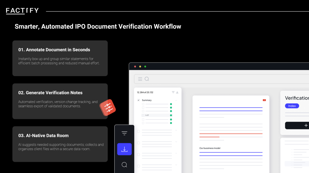 In this environment, robust verification is not just a compliance requirement; it is central to market integrity and investor confidence. Poorly substantiated disclosures expose issuers and sponsors to regulatory intervention, reputational damage, and potential civil or even criminal liability. With deal teams juggling multiple transactions, manual sampling-based checks and spreadsheet-driven tracking significantly increase the risk of omissions, inconsistencies, and misinterpretations across lengthy prospectuses and supporting documents. The message from regulators is clear: scaling deal volume cannot come at the expense of verification quality or proper supervision of the IPO process.